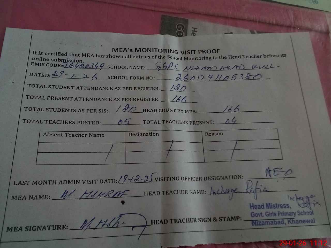| EMIS Code: 36420349 | Name of School: GGPS NIZAM ABAD, KHANEWAL | |||