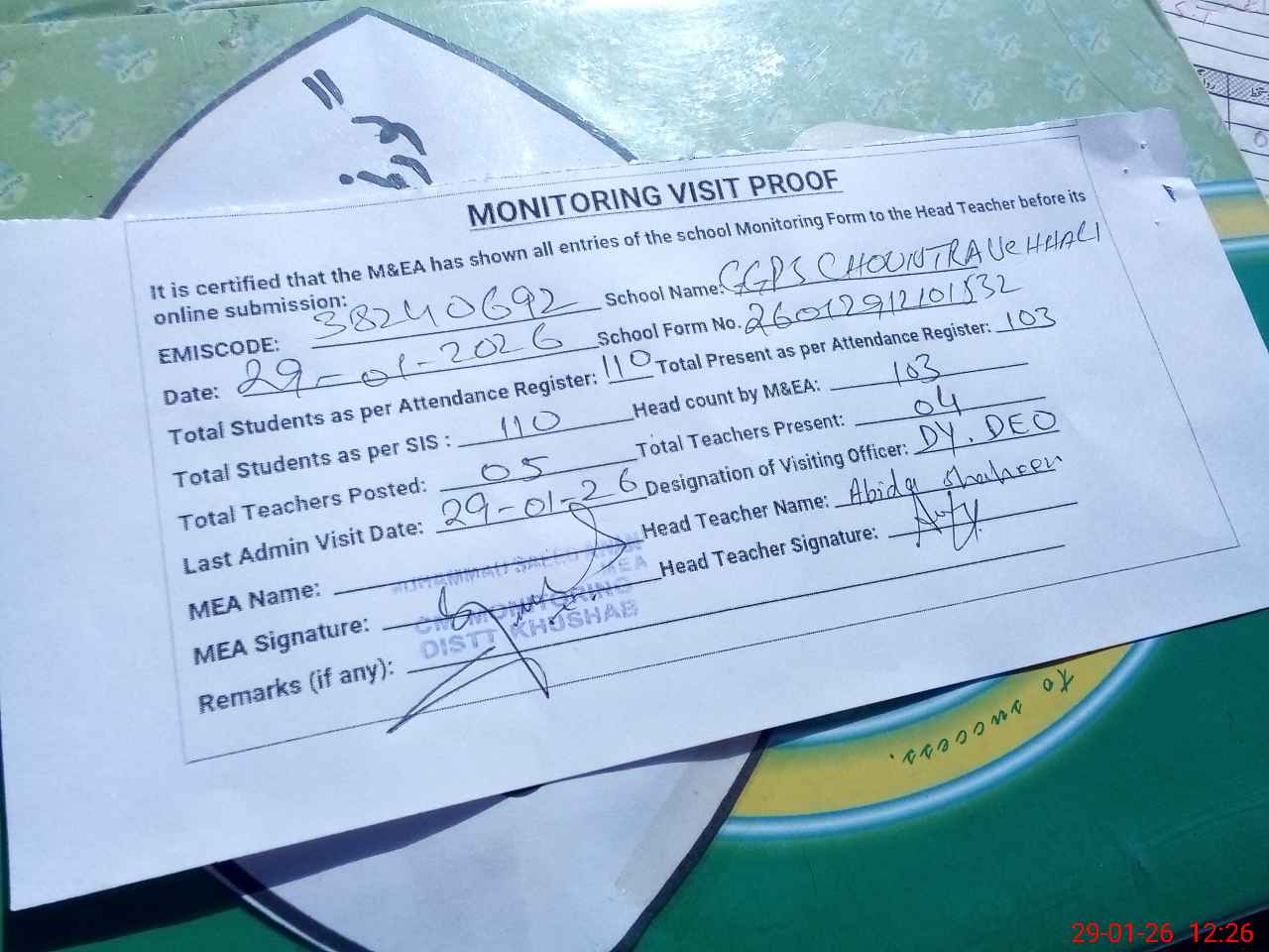 | Remarks (Use Separate Page if Required): Students on SIS Qty 110 Last admin visit On 29 January 2026 by Dy.DEO | |||||