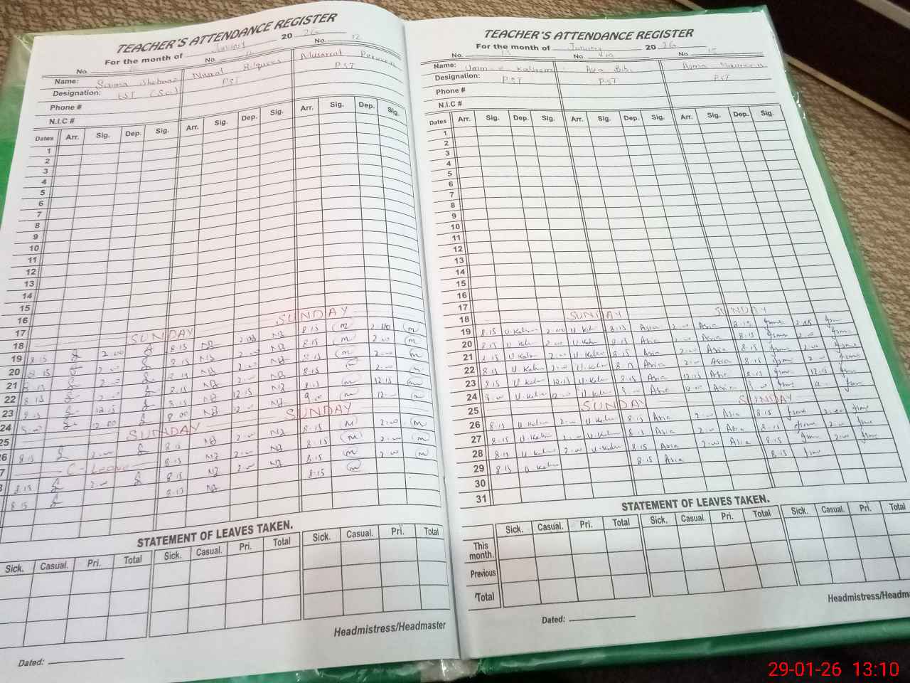 | CNIC | Full Name | Designation | R/C | Absence During Last Calender Month |