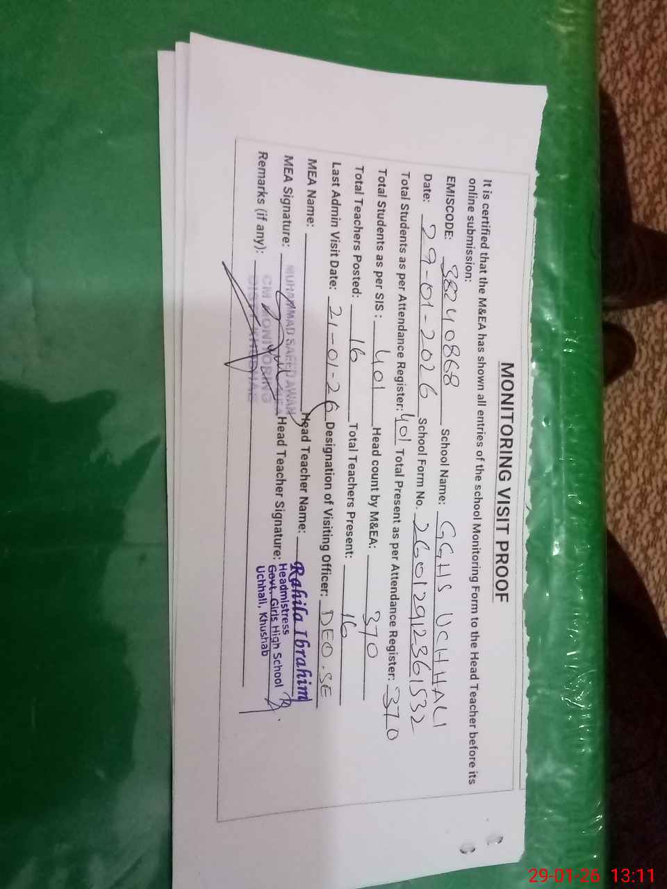 | Remarks (Use Separate Page if Required): Students on SIS 401 Last admin visit On 21 January 2026 by DEO.SE | |||||