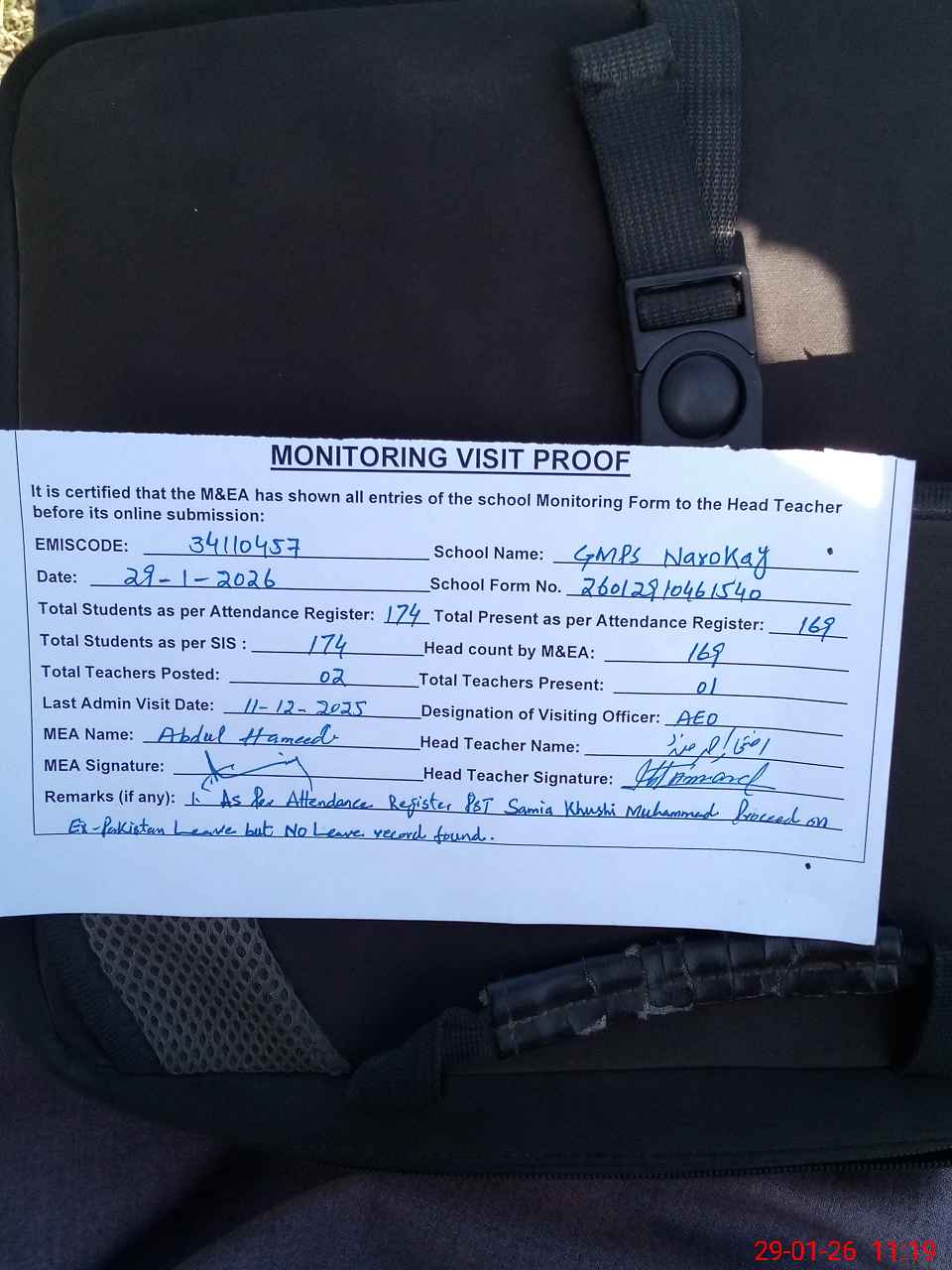 | Attendance Register | Head Teacher | MEA with School | Visit Proof |