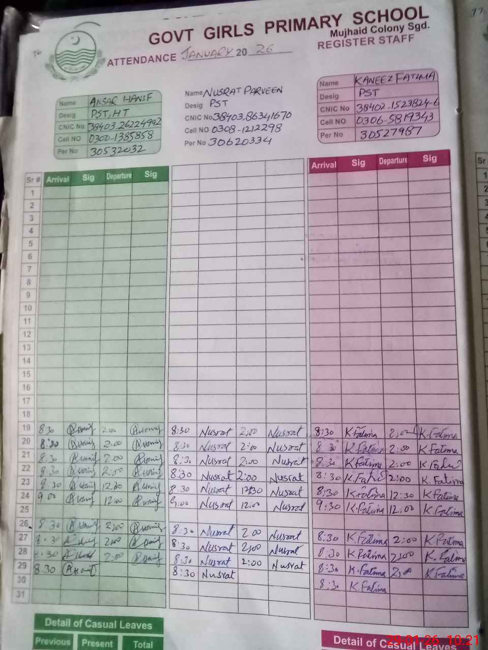 | CNIC | Full Name | Designation | R/C | Absence During Last Calender Month |