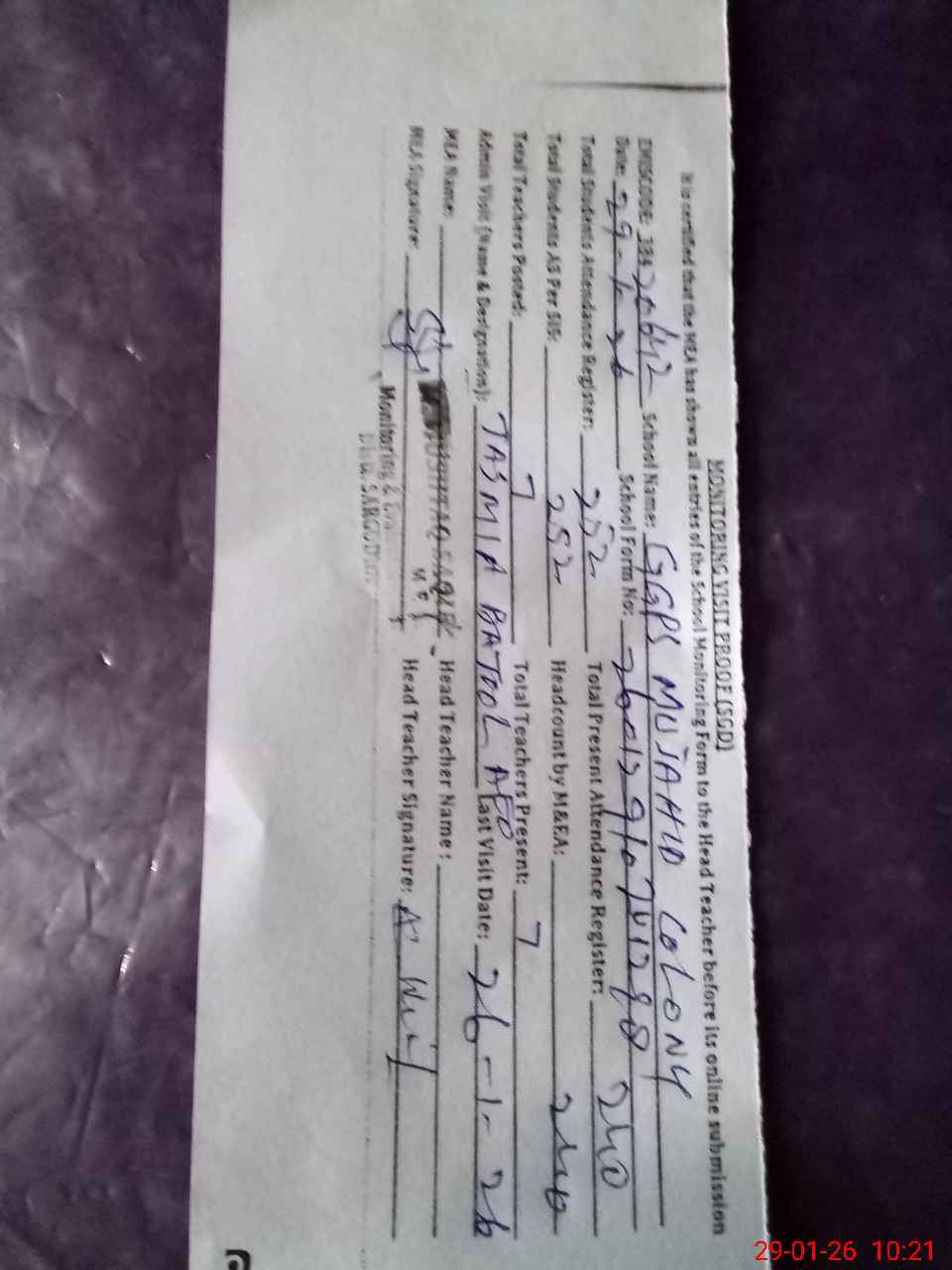 | Attendance Register | Head Teacher | MEA with School | Visit Proof |