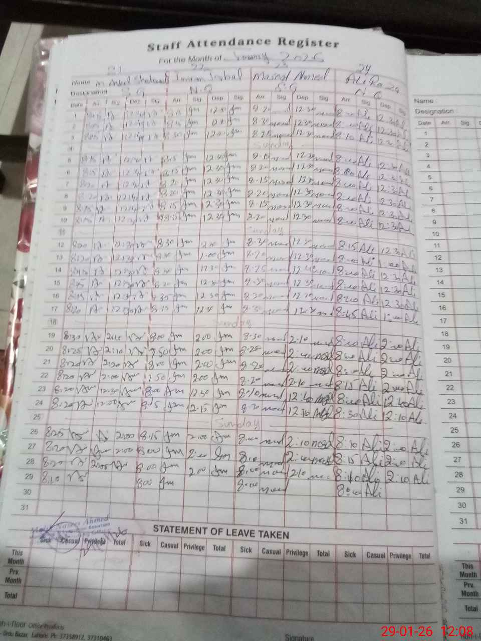 | CNIC | Full Name | Designation | R/C | Absence During Last Calender Month |