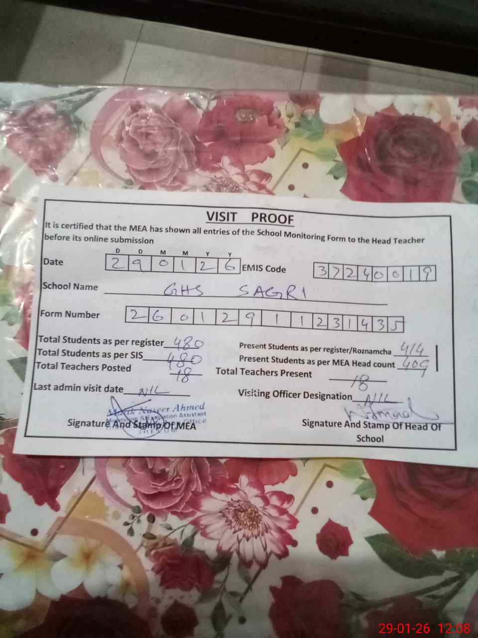 | Attendance Register | Head Teacher | MEA with School | Visit Proof |