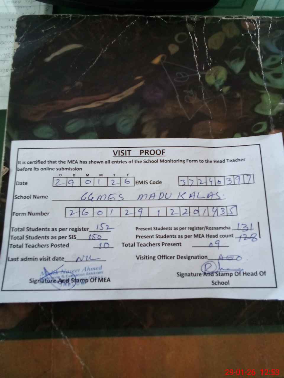 | Attendance Register | Head Teacher | MEA with School | Visit Proof |