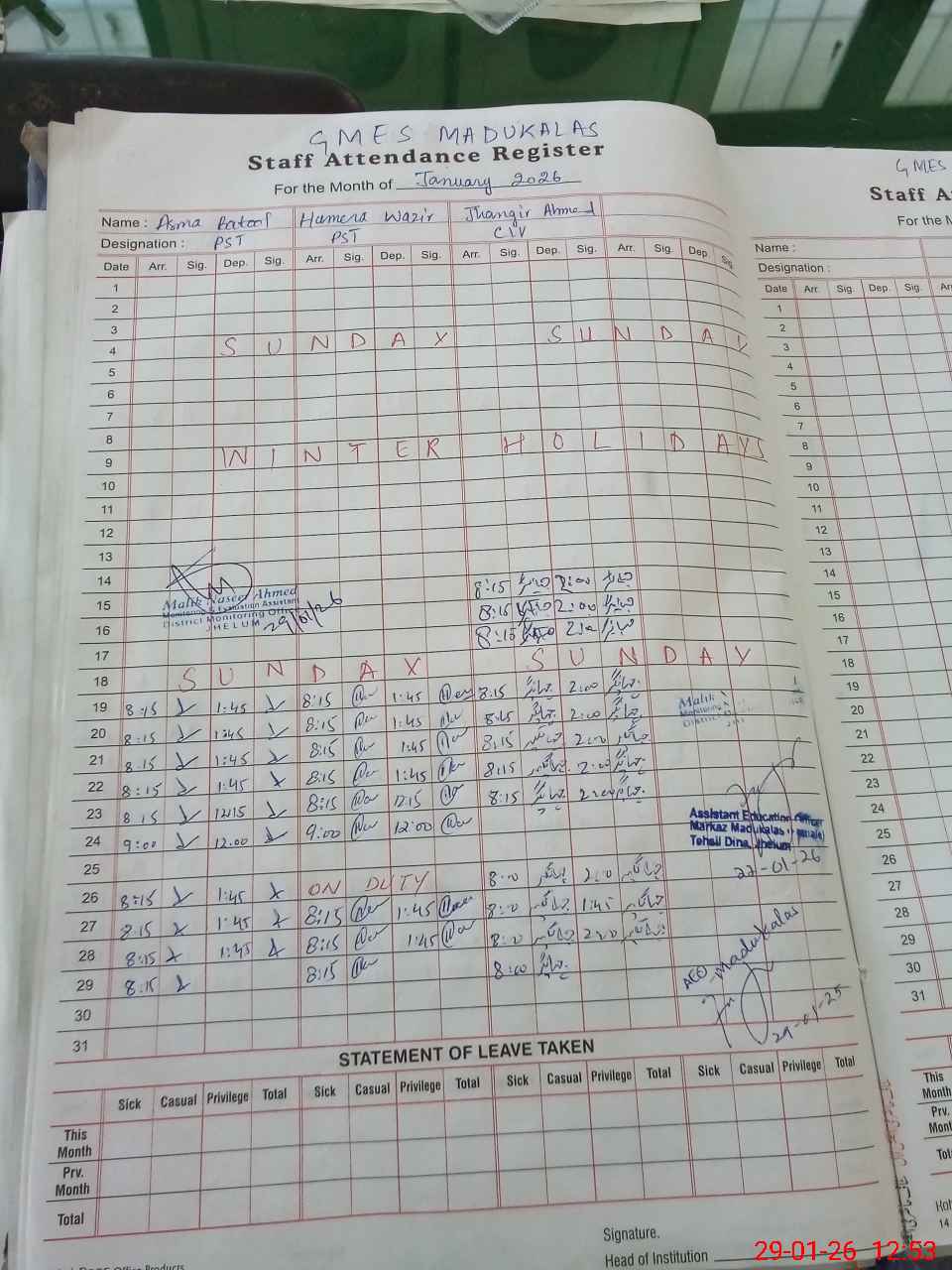| Monitoring Date: 29-01-2026 | Start Time: 29-01-2026 12:20 PM | End Time: 29-01-2026 12:54 PM | Name of MEA: Na**** Ah**** | |