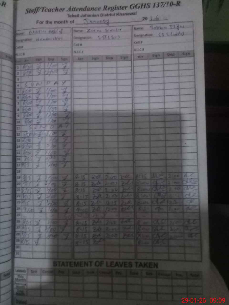 | CNIC | Full Name | Designation | R/C | Absence During Last Calender Month |