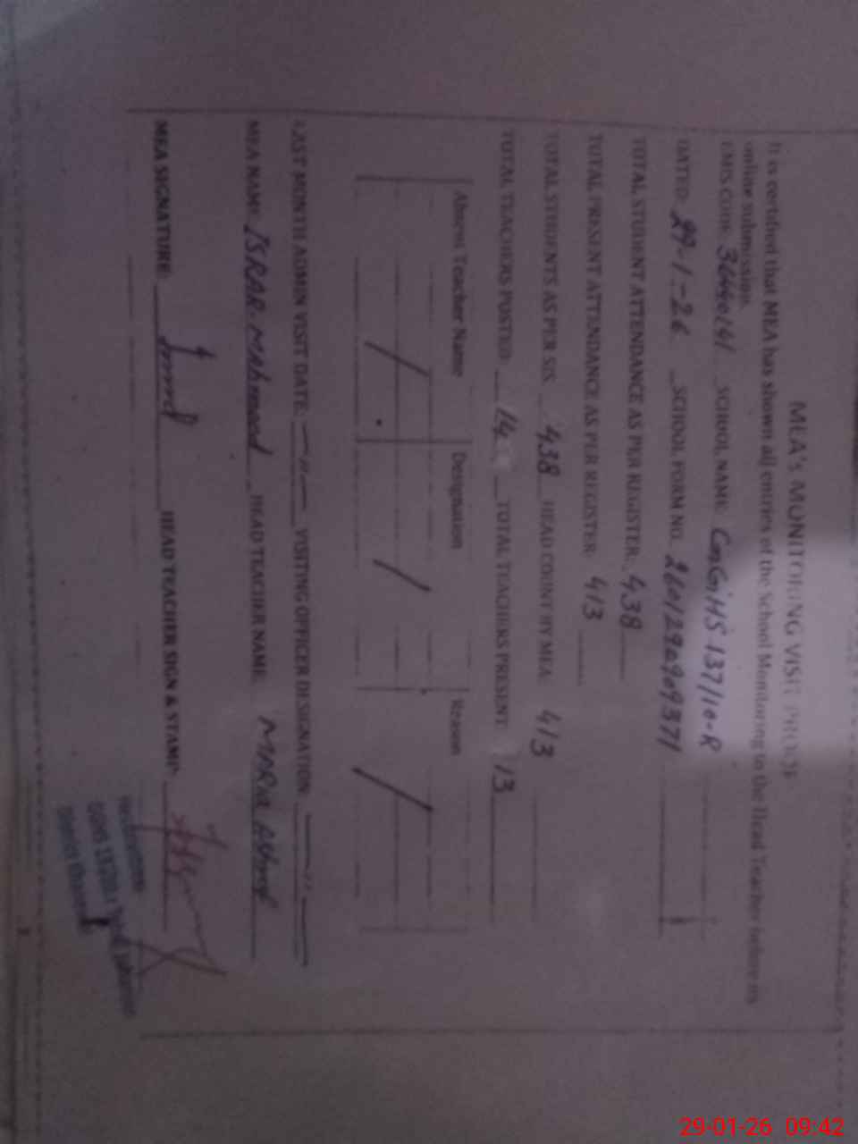 | Attendance Register | Head Teacher | MEA with School | Visit Proof |