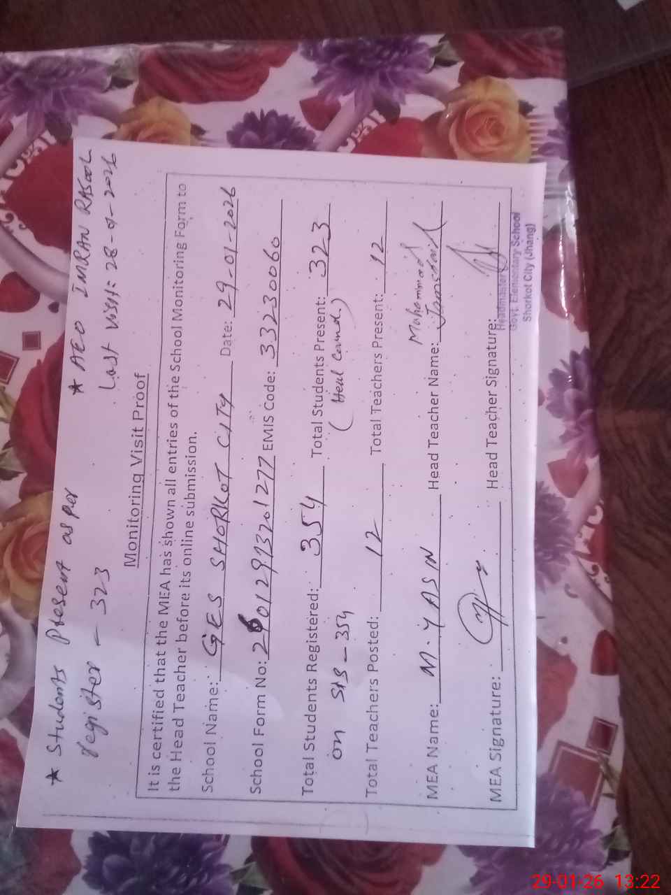 | Attendance Register | Head Teacher | MEA with School | Visit Proof |