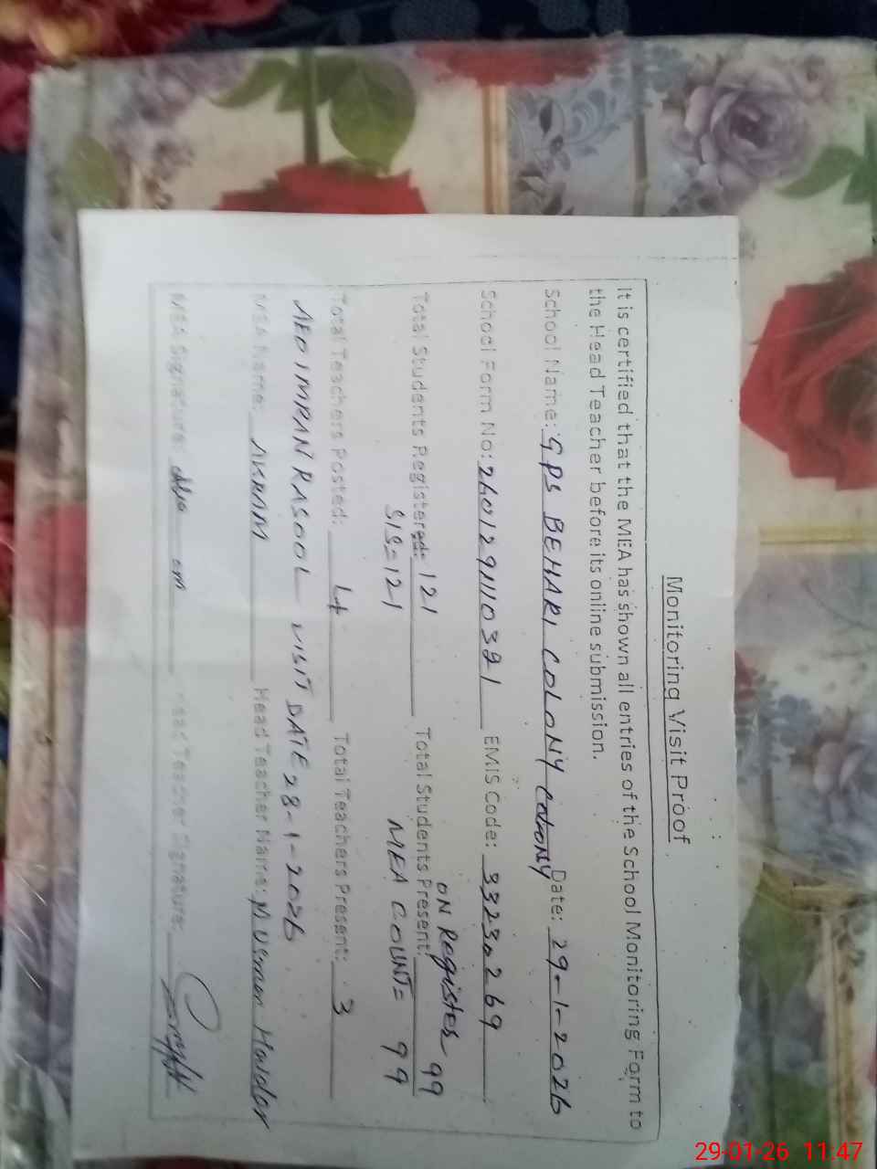 | Attendance Register | Head Teacher | MEA with School | Visit Proof |