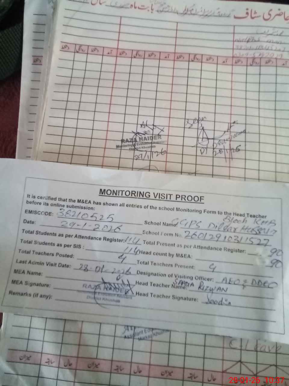 | Attendance Register | Head Teacher | MEA with School | Visit Proof |
