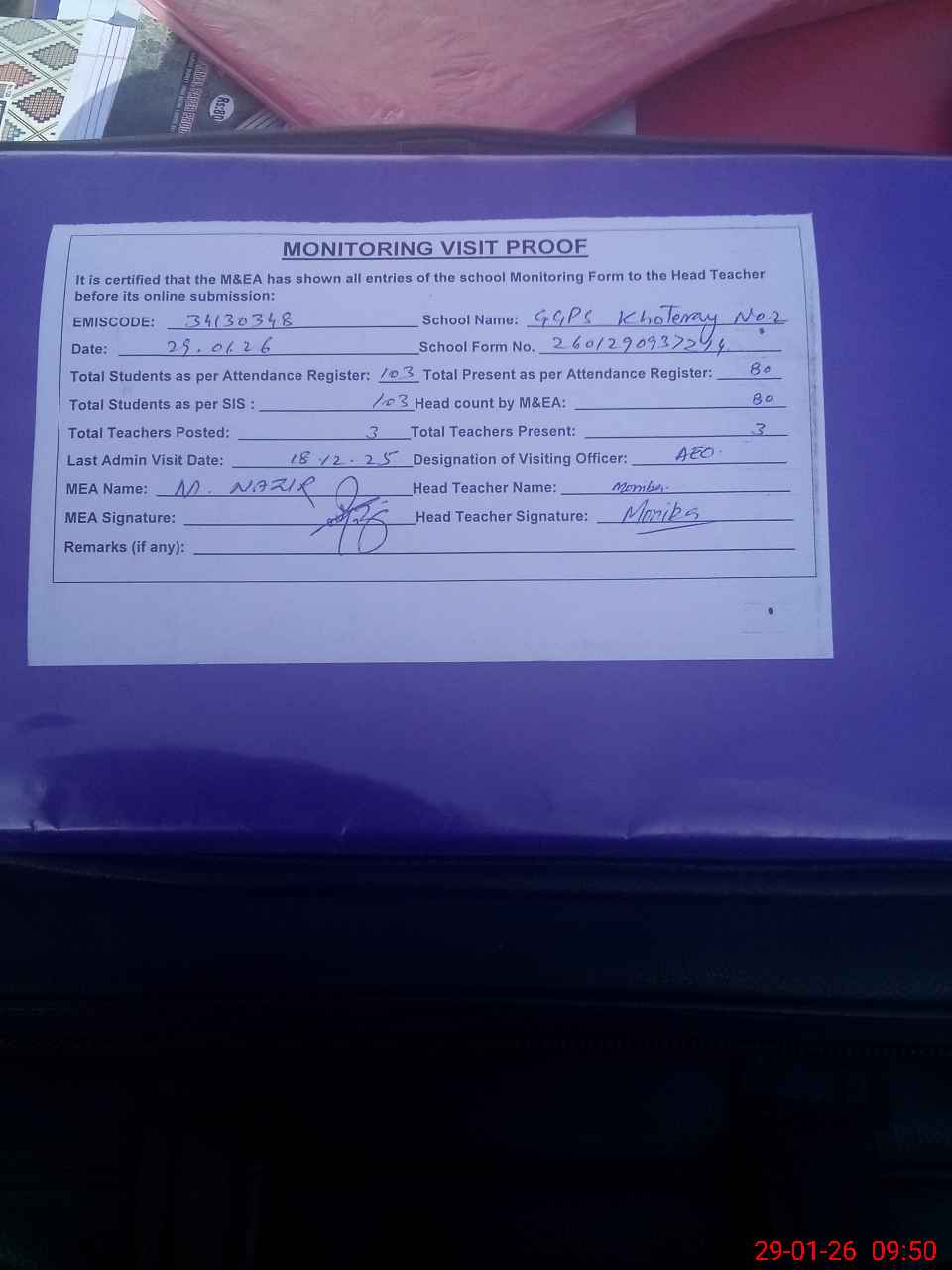 | Attendance Register | Head Teacher | MEA with School | Visit Proof |