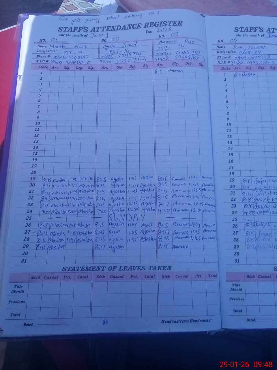 | CNIC | Full Name | Designation | R/C | Absence During Last Calender Month |