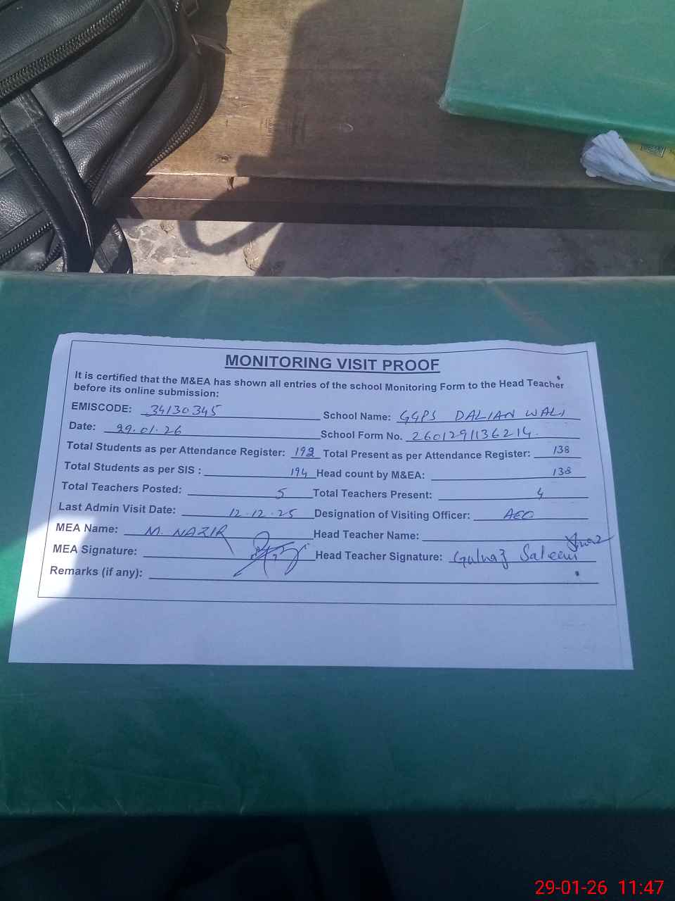 | Attendance Register | Head Teacher | MEA with School | Visit Proof |