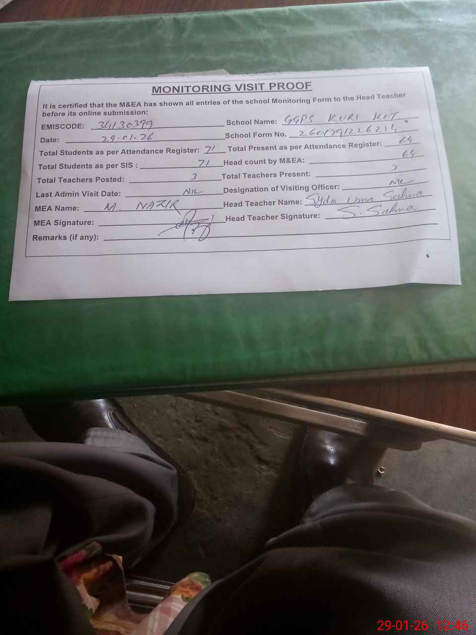 | Attendance Register | Head Teacher | MEA with School | Visit Proof |