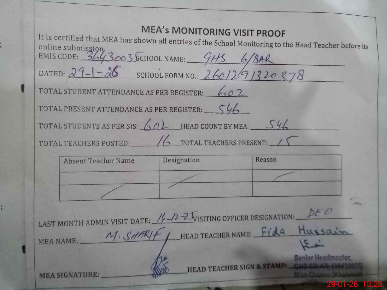 | Attendance Register | Head Teacher | MEA with School | Visit Proof |
