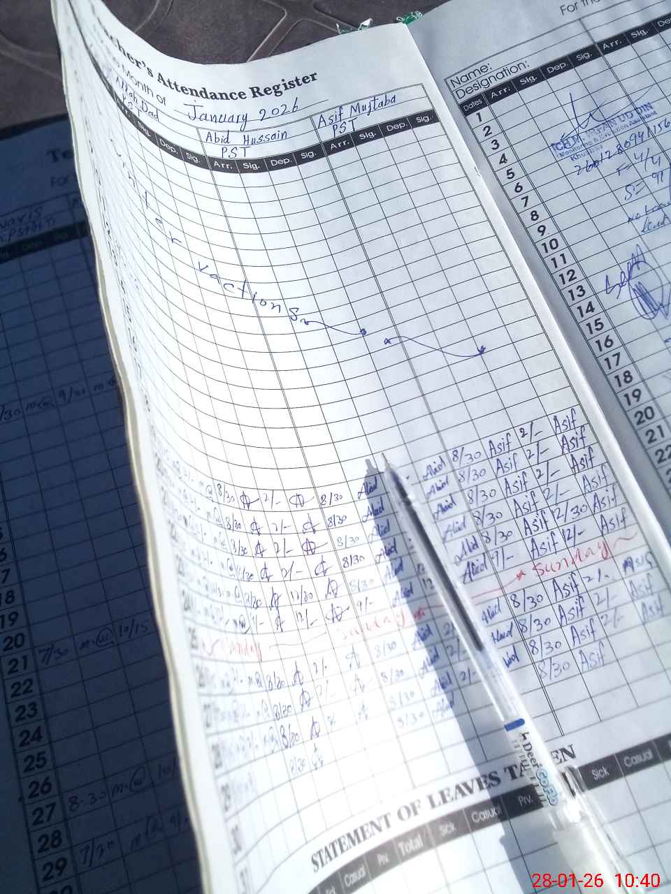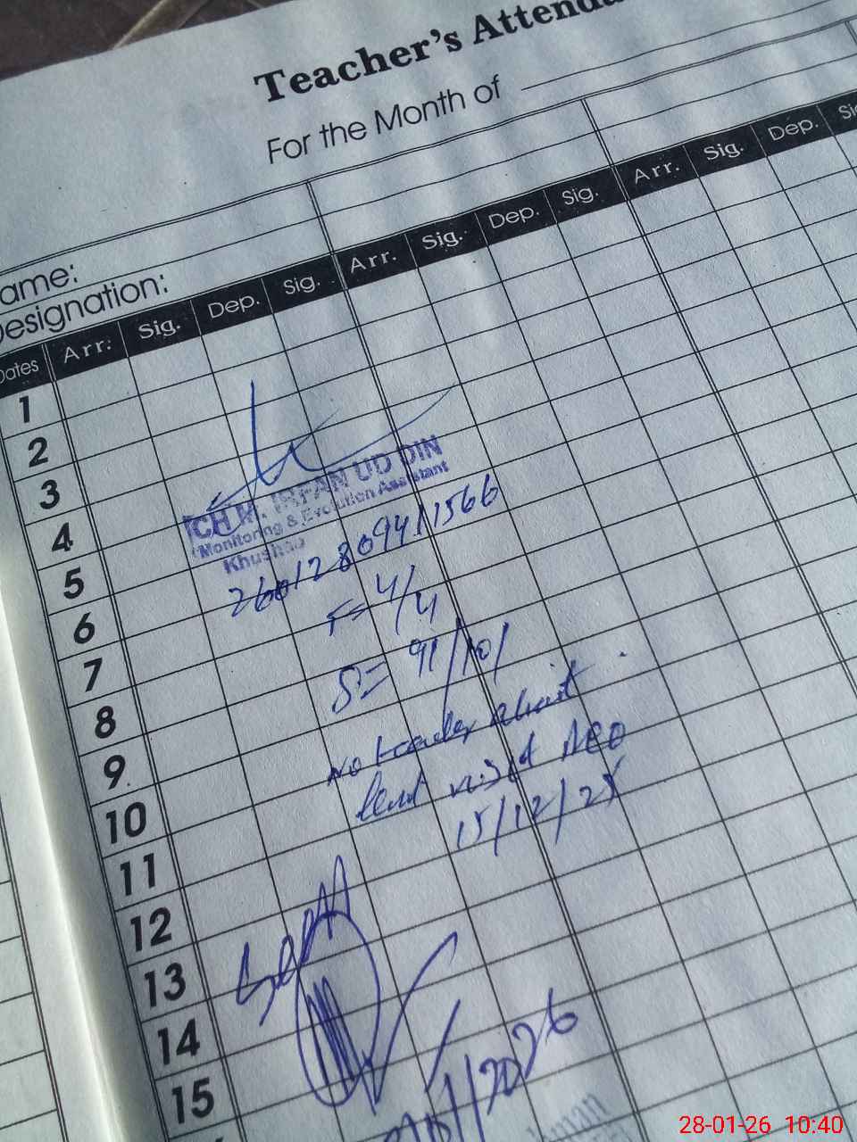 | Remarks (Use Separate Page if Required): gps Dera m sher student on sis 101 student on register 101 head count 91 no teacher absent last visit aeo 15/12/25 | |||||
