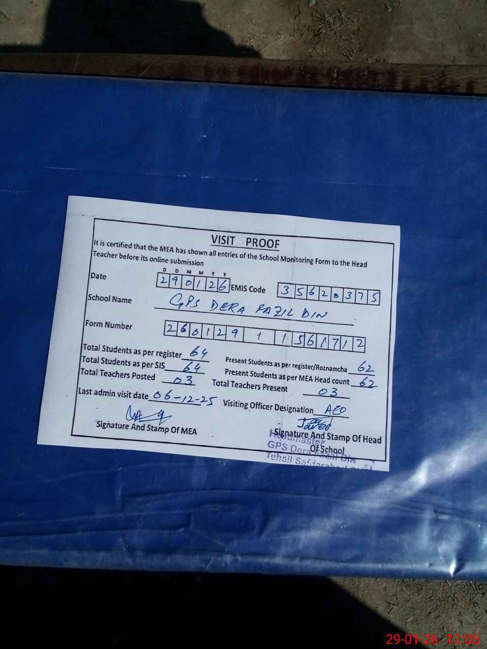 | Attendance Register | Head Teacher | MEA with School | Visit Proof |