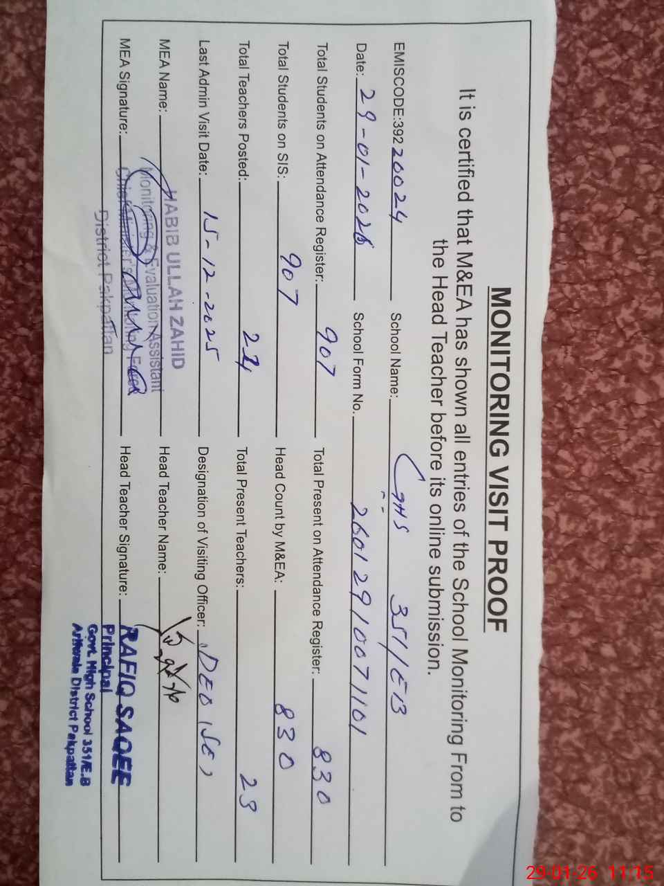 | Certified that this School was Inspected by the Undersigned MEA/DMO Today and the Information Stated Above is as Per Record. | |||||