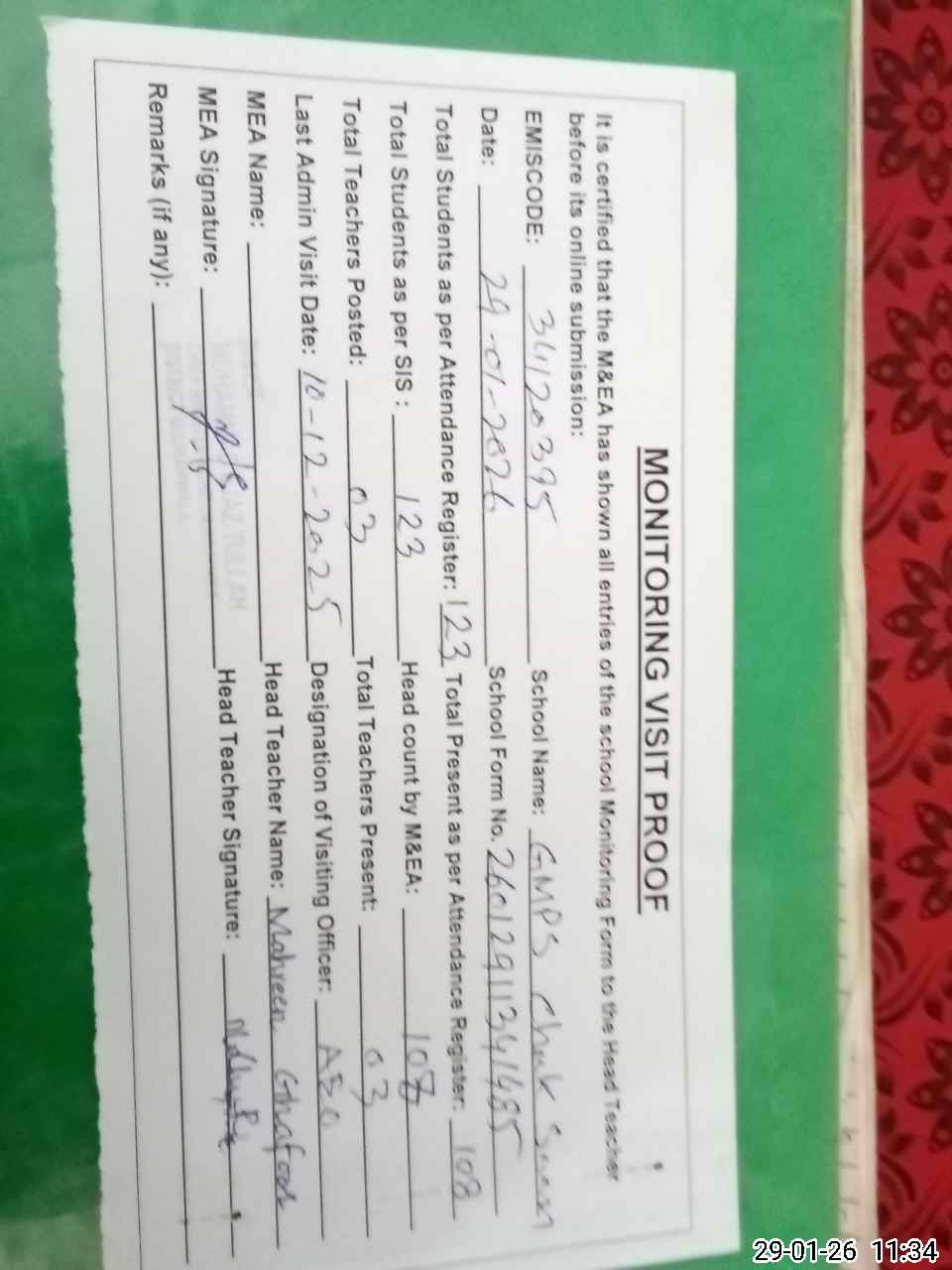 | Attendance Register | Head Teacher | MEA with School | Visit Proof |