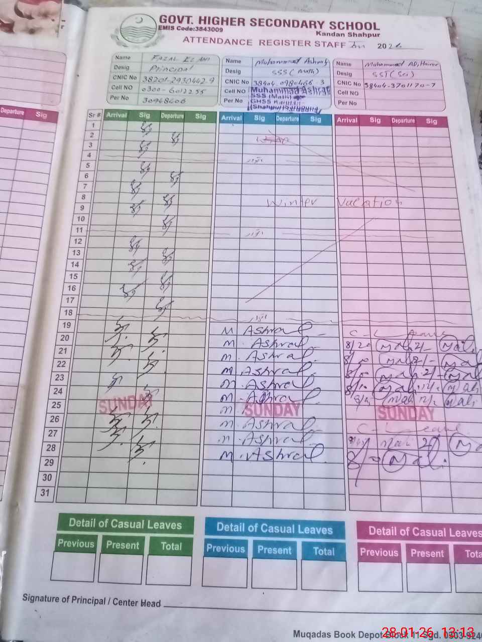 | CNIC | Full Name | Designation | R/C | Absence during last cal. month |