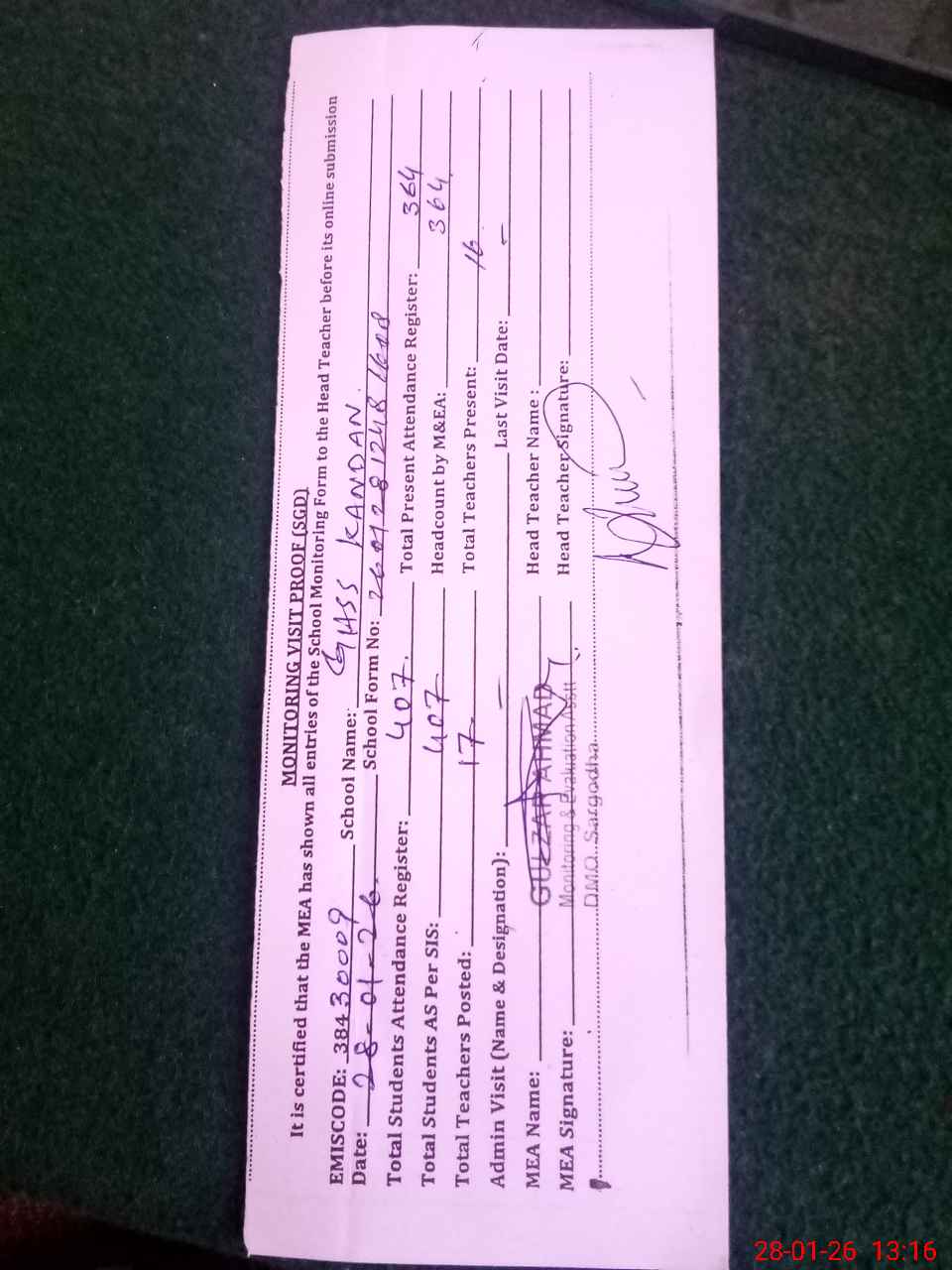 | Attendance Register | Head Teacher | MEA with School | Visit Proof |