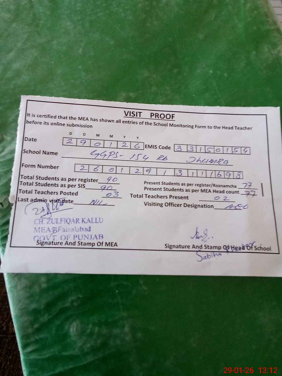 | Attendance Register | Head Teacher | MEA with School | Visit Proof |