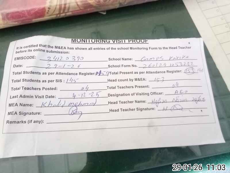 | Attendance Register | Head Teacher | MEA with School | Visit Proof |