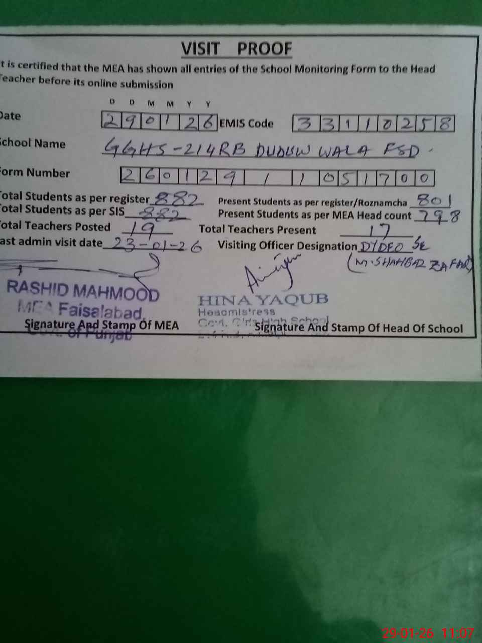 | Attendance Register | Head Teacher | MEA with School | Visit Proof |