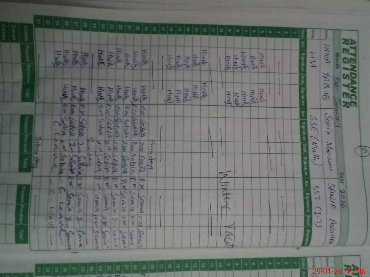 | CNIC | Full Name | Designation | R/C | Absence During Last Calender Month |