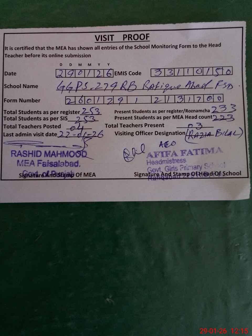 | Attendance Register | Head Teacher | MEA with School | Visit Proof |