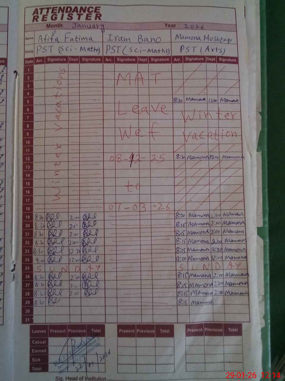 | 33**** | Ir**** Ba**** | PST Science/Maths | Regular | 24 | 0 | 0 | 24 | 0 | 0 | 0 | 0 | 0 | Maternity |