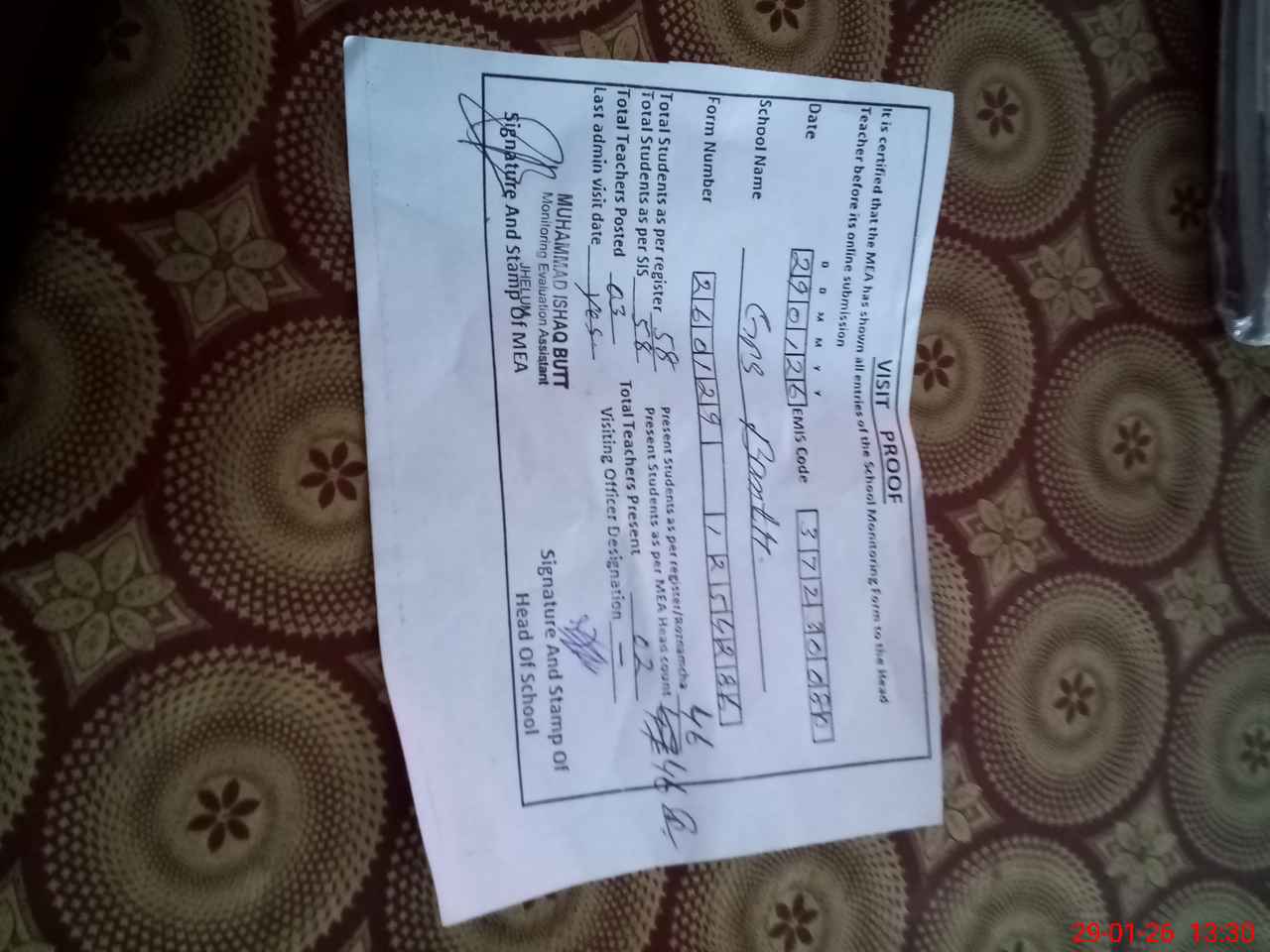 | Certified that this School was Inspected by the Undersigned MEA/DMO Today and the Information Stated Above is as Per Record. | |||||
