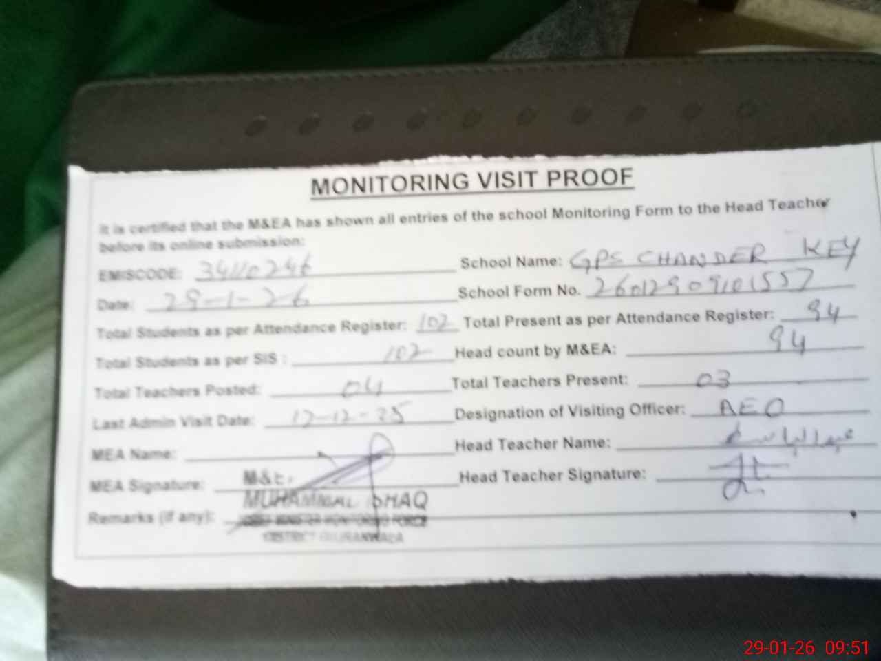 | Attendance Register | Head Teacher | MEA with School | Visit Proof |