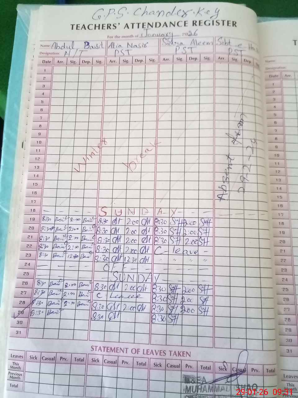 | Leave | Duty | Absent | Maternity | Medical | Ex- Pak |