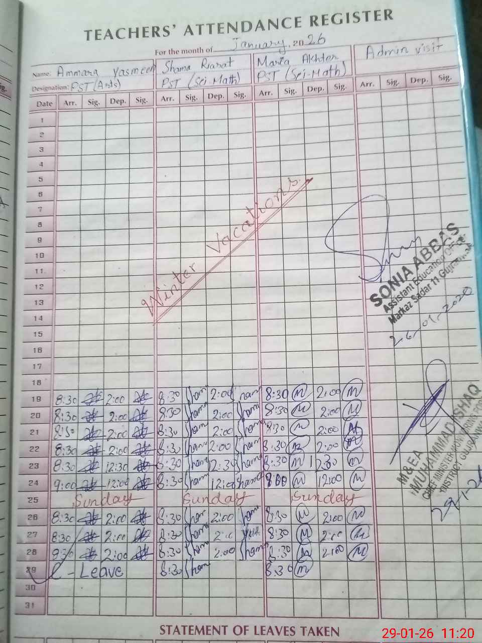 | Remarks (Use Separate Page if Required): PST AMARA YASEEN IS ABSENT FROM SCHOOL NO LEAVE RECORD NSB AND FTF RECORD NOT SHOW DUE TO HEAD TEACHER ARE ABSENT FROM SCHOOL | |||||