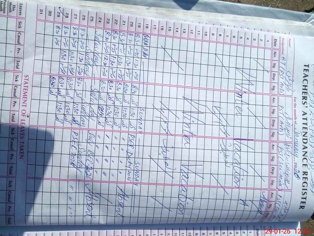 | 34**** | Un**** Ja**** | PST Science/Maths | Regular | 0 | 0 | 31 | 0 | 0 | 0 | 0 | 0 | 0 | Absent (Un-Authorized) |