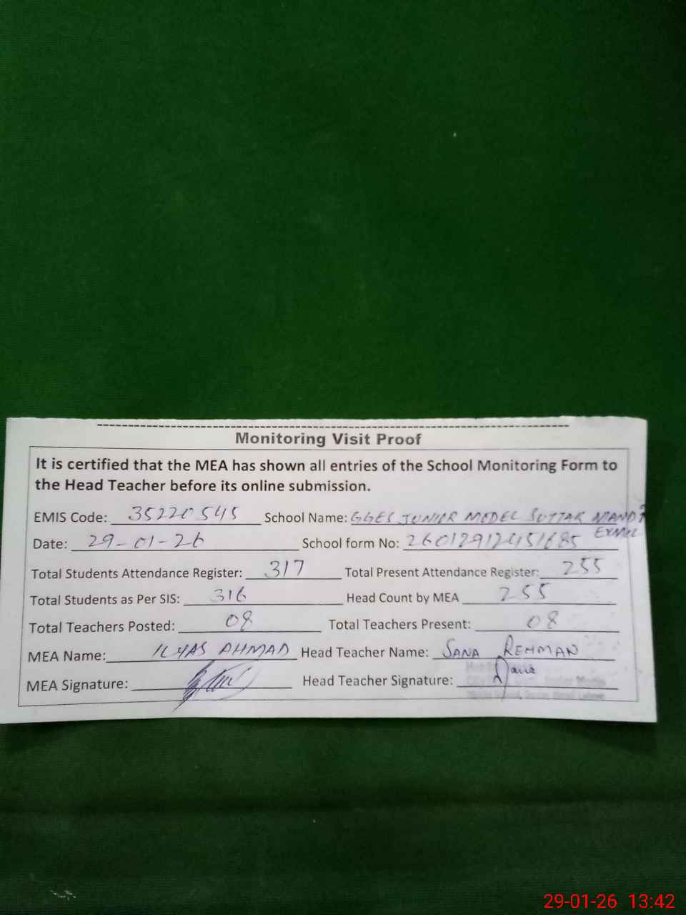 | Attendance Register | Head Teacher | MEA with School | Visit Proof |