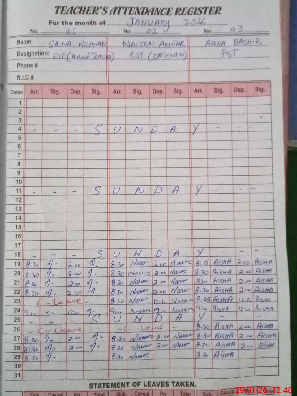 | CNIC | Full Name | Designation | R/C | Absence During Last Calender Month |