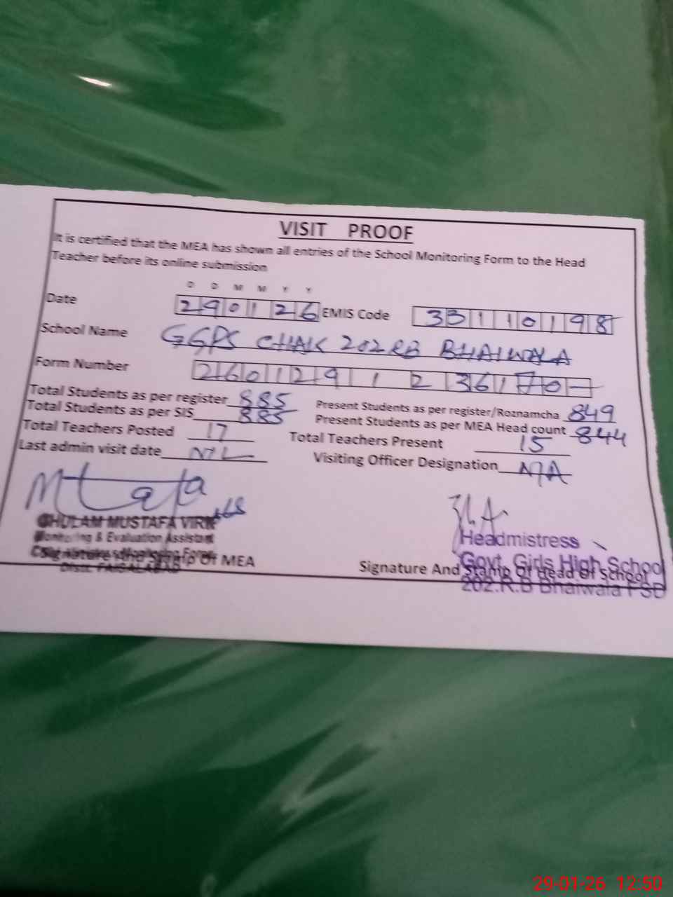 | Attendance Register | Head Teacher | MEA with School | Visit Proof |