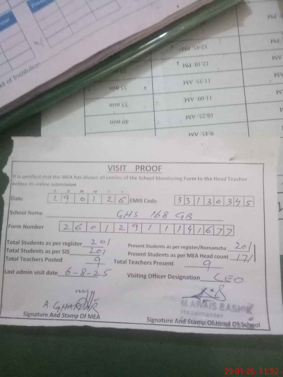 | Attendance Register | Head Teacher | MEA with School | Visit Proof |