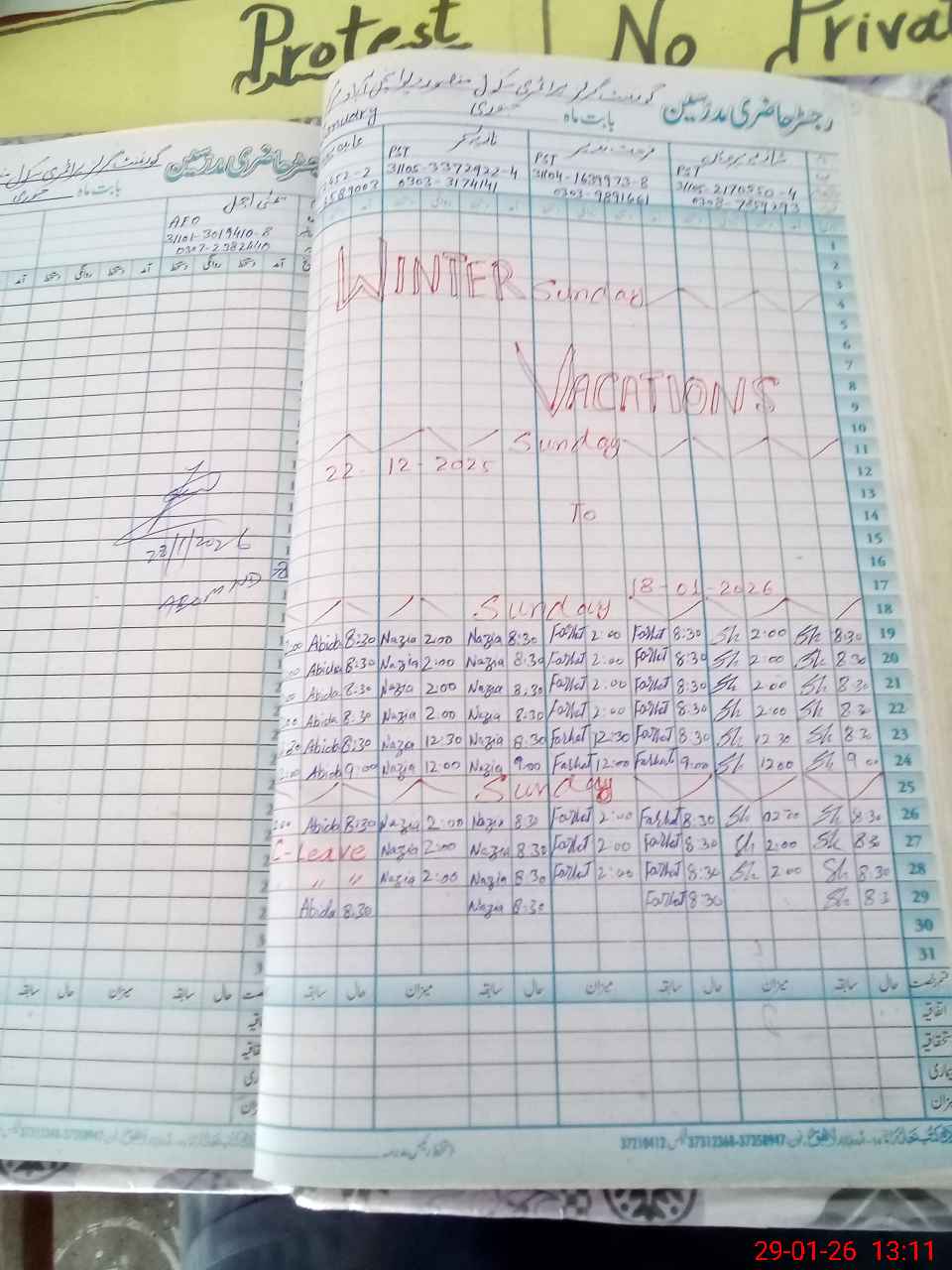 | CNIC | Full Name | Designation | R/C | Absence During Last Calender Month |