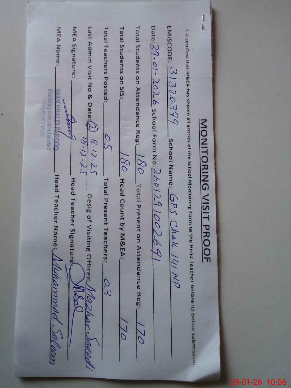| Attendance Register | Head Teacher | MEA with School | Visit Proof |