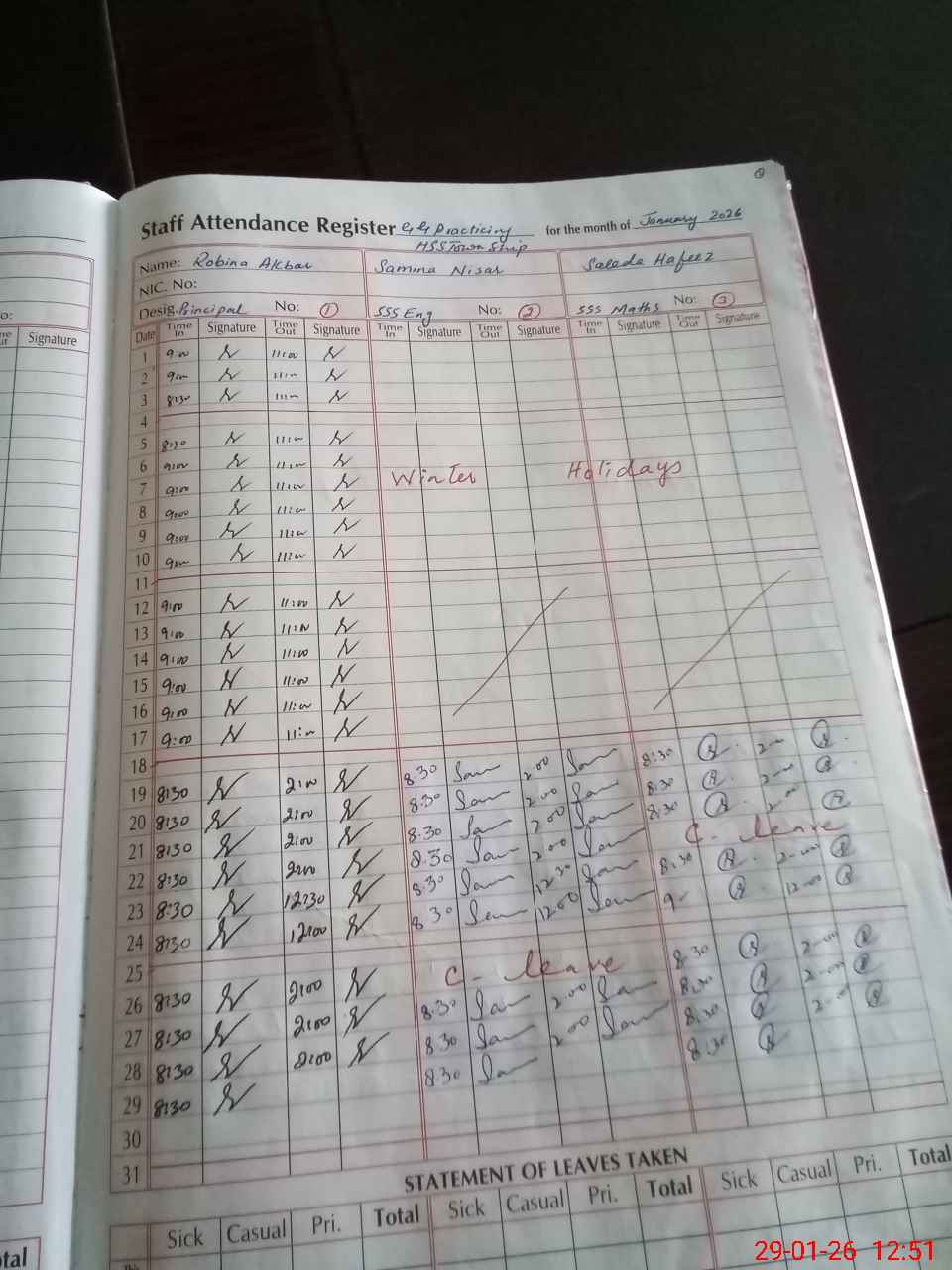 | Leave | Duty | Absent | Maternity | Medical | Ex- Pak |
