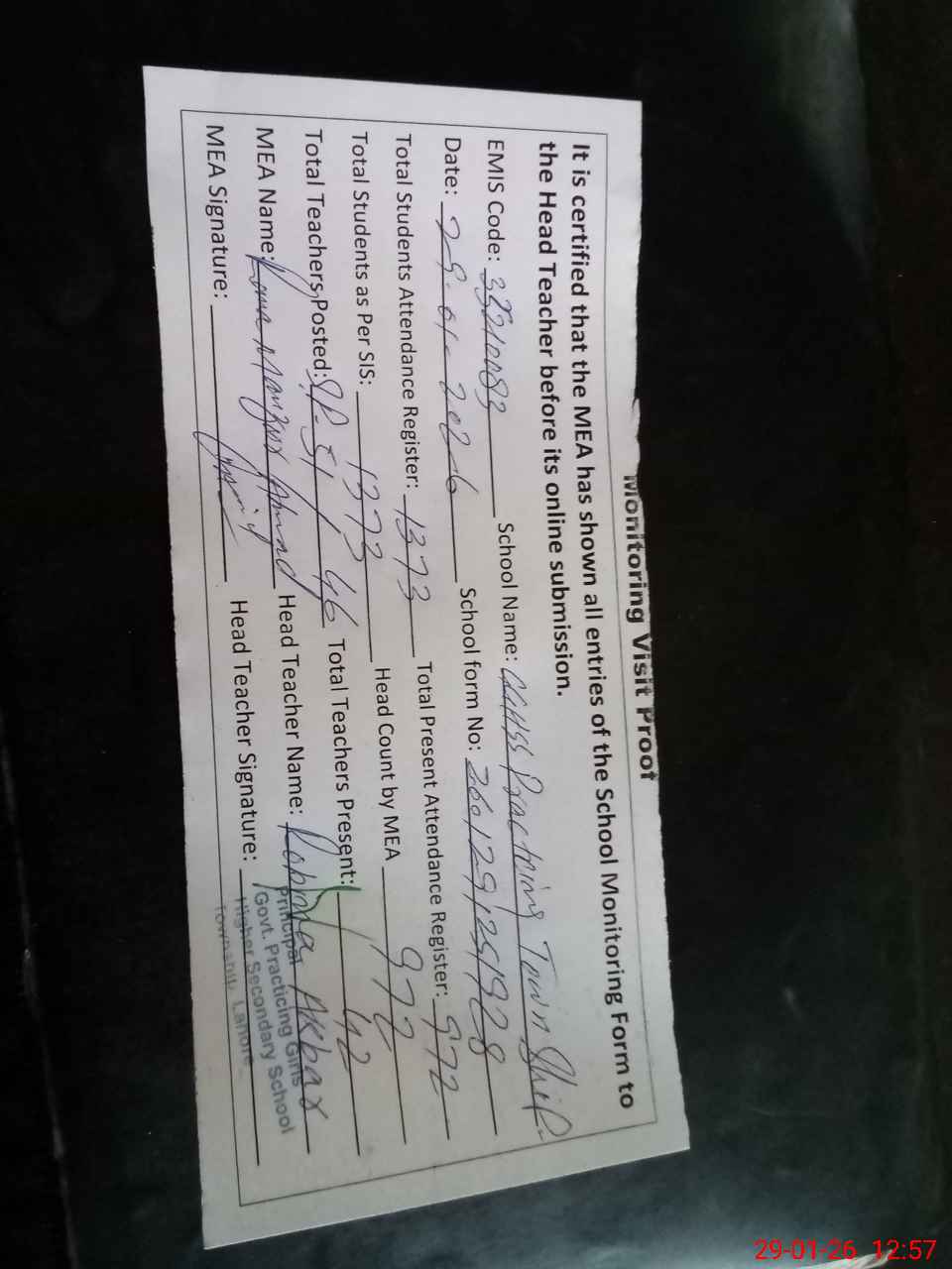 | Attendance Register | Head Teacher | MEA with School | Visit Proof |