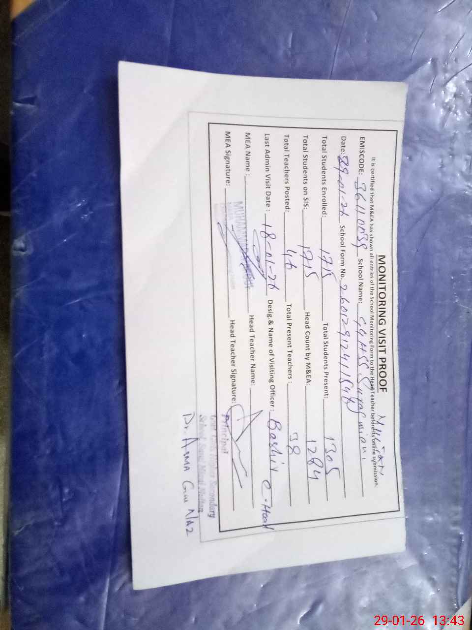| Attendance Register | Head Teacher | MEA with School | Visit Proof |