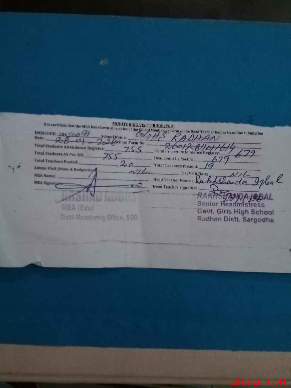 | Attendance Register | Head Teacher | MEA with School | Visit Proof |