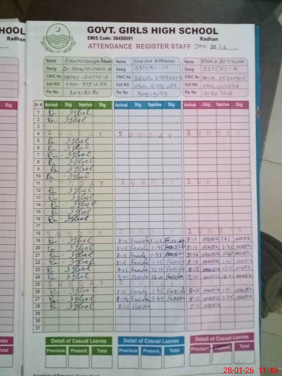 | CNIC | Full Name | Designation | R/C | Absence during last cal. month |