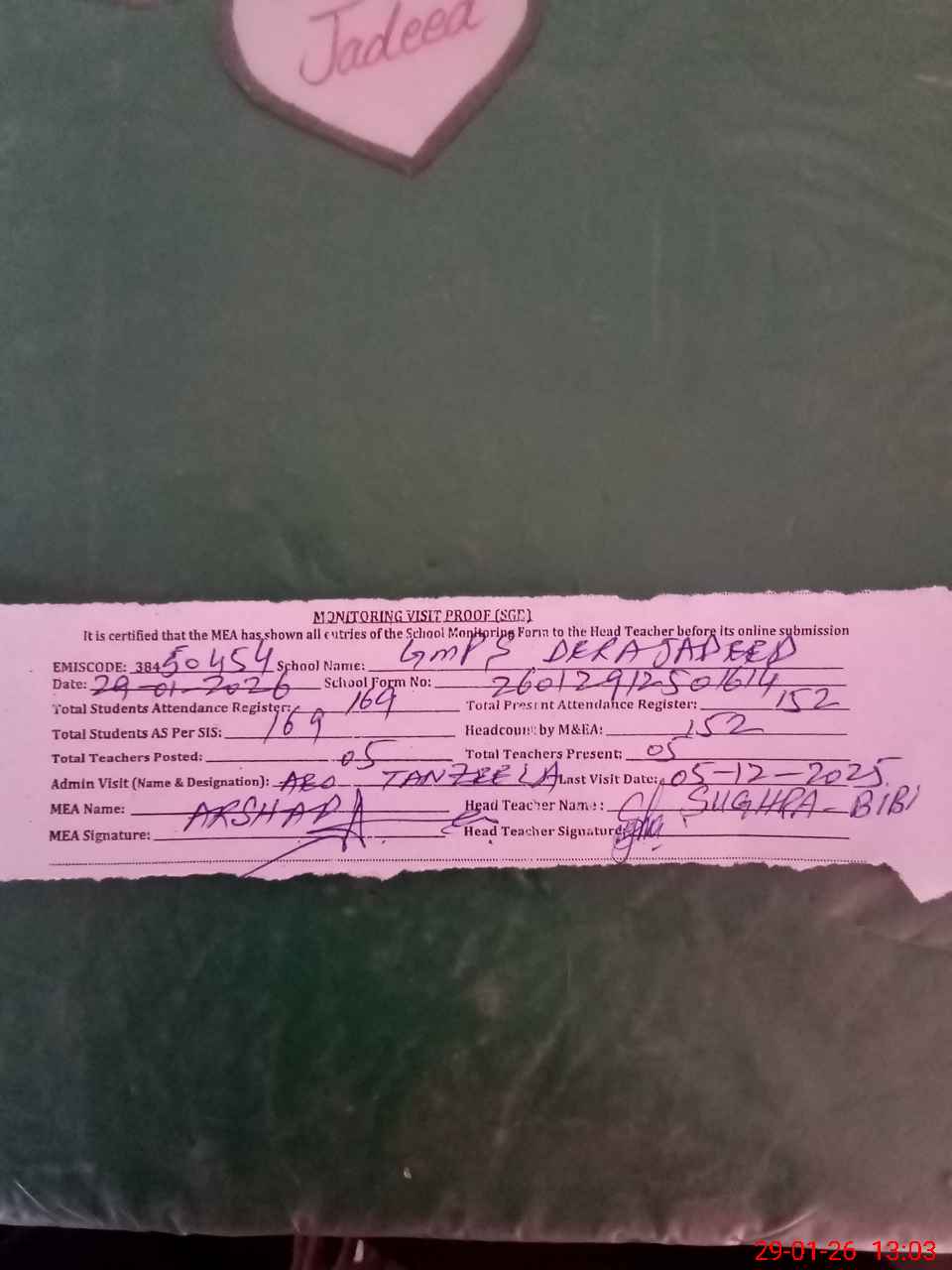 | Attendance Register | Head Teacher | MEA with School | Visit Proof |